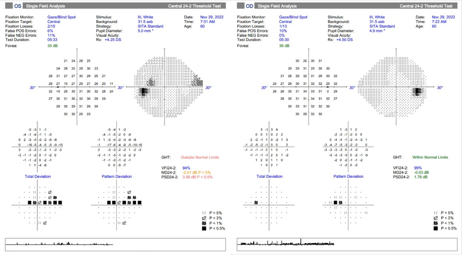 - optic nerve assessment and visual field findings