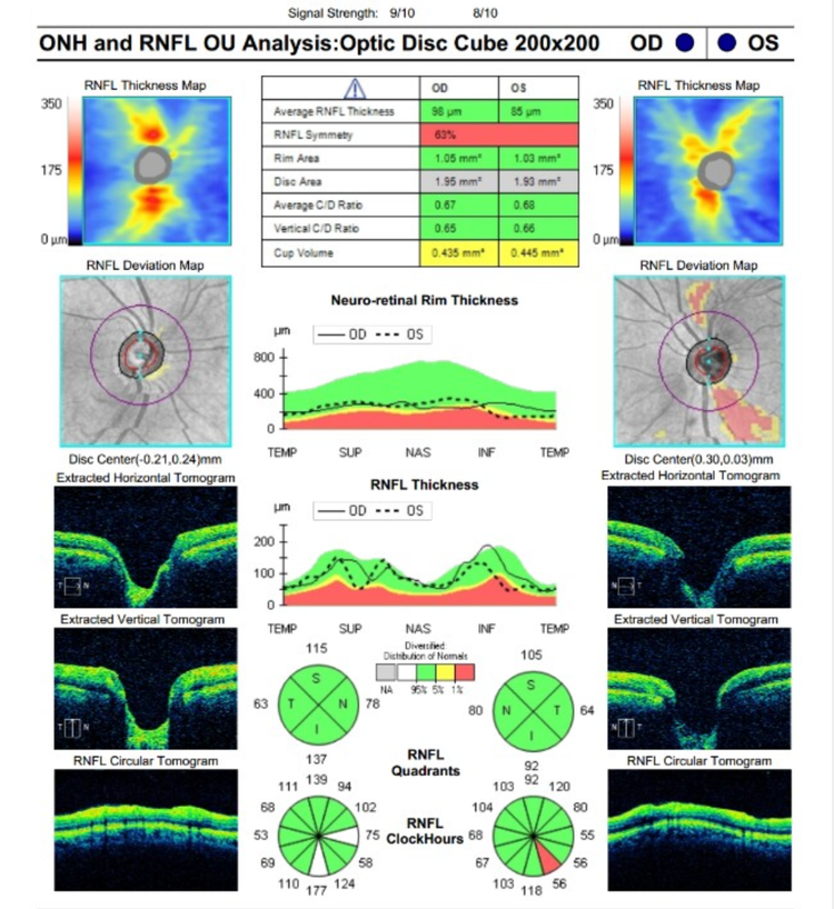 - beware when comparing signal strength 9/10 to prior 7/10 - a “stable” RNFL thickness of same value may actually be masking progression